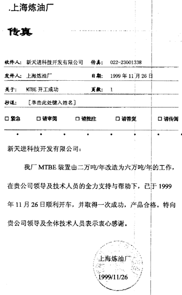 新天进公司已将填料塔技术已成功应用于甲醇、乙醇、异丙醇、丁醇、辛醇等的精制及回收。 高效填料塔/板式塔技术用于10万吨/年燃料乙醇装置节能扩产改造,燃料乙醇产量提高至20万吨/年,改造后蒸汽总耗量不变,蒸汽单耗大幅度降低。 采用高效填料塔技术成功的完成了目前单套最大生产能力生物柴油装置——新加坡30万吨/年生物柴油分离系统设计及塔内件制造。 采用高效填料塔技术、三塔双效热集成工艺成功的完成了陕西榆林20万吨/年甲醇精馏系统设计、制造,2004年11月25日一次开车成功。 吉化某厂甲醇精馏塔原为Ø2400浮阀塔,年产5万吨甲醇,塔釜甲醇损失严重,废水中甲醇含量2~3%,经改造成高效填料塔,产量可达年产10万吨甲醇,塔釜甲醇含量小于0.1%。 Ø1400、Ø1100、Ø900、Ø800丁辛醇技改工程(吉林) 此外,我公司还对吉林、上海、保定、成都、燕山、湖北、南通、山西、北京、山东等等甲醇精馏、甲醇回收、乙醇回收、脱醇装置进行了设计改造或设计制造,效果良好。 齐鲁某厂,大庆某厂、吉林某厂的丁辛醇精馏装置、长松某厂季戊四醇脱醛塔改造成高效填料塔后,产品产量和收率大大提高,经济效益显著。 Ø2600乙醇装置水洗塔改造,吉林 Ø600丙酮氰醇精馏塔,吉林 Ø1000 生物柴油甲醇回收塔,印尼 Ø1000 MTBE甲醇回收塔,辽宁 Ø1000 MTBE甲醇回收塔,北京 Ø2000 甲醇回收塔,江苏 Ø2000 甲醇回收塔,河北 Ø1000 MTBE甲醇回收塔,湖北 Ø1000、Ø1800 8万吨/年甲醇精馏系统,陕西 Ø1400、Ø2400 16万吨/年甲醇精馏系统,陕西 Ø1600、Ø2200、Ø1800 30万吨/年甲醇精馏系统,陕西 Ø2400 20万吨/年甲醇精馏塔,吉林 Ø900、Ø1400 6.6万吨/年甲醇精馏系统,辽宁 [ TOP ]