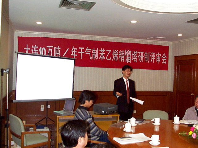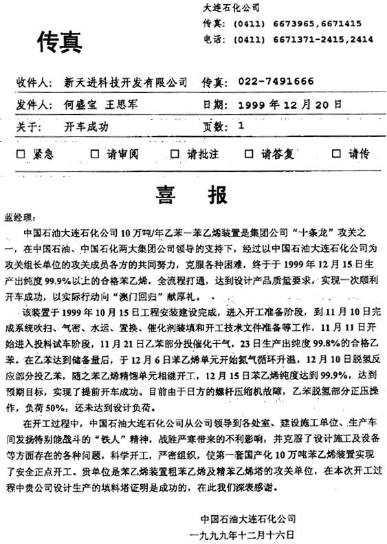 1998年9月,新天进公司与辽宁某石化公司签定合同,进行其10万吨/年苯乙烯精馏系统粗苯乙烯和精苯乙烯塔内件设计及制造,并于98年11月通过中石化集团公司组织的专家评审(评审会照片、现场评审照片、评委名单、评审意见)。99年12月一次开车成功。