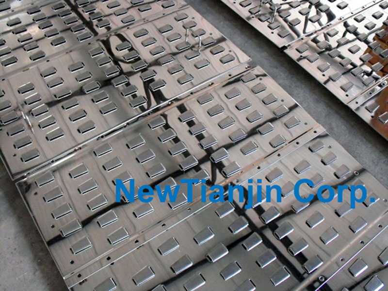 TJV耐堵条形浮阀塔板是一种改进型高效条形导向浮阀塔板,其气液分布传质过程与浮阀塔板相似,整个塔板结构简单,耐腐蚀、抗堵塞性好,是一种优良的传质构件。TJV耐堵条形浮阀塔板结构如下图所示。 耐堵条阀上设置了限位片,此限位片确保了浮阀在任何情况下都会提供一个最小浮阀开启高度。不会出现普通浮阀由于“卡死”而无法正常开启或浮动,导致的整个浮阀塔无法正常运行的现象。它将普通条形浮阀与固阀塔板有机地结合在一起,既具有固阀塔板的高耐堵塞性,又具有普通条形浮阀塔板的气液导流、均匀分布的功能。TJV耐堵条形浮阀对应塔板开孔采用两个或多个开孔,浮阀在塔板开孔内上下浮动,它将传统浮阀塔板的单一鼓泡传质,变为导向传质,使整个塔截面上气液分布更加均匀,使得塔的操作弹性大大提高,处理能力较普通浮阀塔板提高30%以上,分离效率较普通浮阀塔板提高10%以上。 特点: (1)阀片开启灵活,不易卡死、堵塞、脱落; (2)独特的限位片结构,确保在任何情况下都会提供两个长度与阀盖相同、高度一定的气相流通面积。不会出现普通浮阀由于“卡死”而无法正常开启或浮动,导致的整个浮阀塔无法正常运行的现象; (3) 处理能力较普通浮阀塔板提高30%以上; (4)分离效率较普通浮阀塔板提高10%以上。 由于TJV耐堵条形浮阀塔板的独特工作机理,因此该塔板用于化工过程中的气液传质、换热设备中具有结构简单、阀片开启灵活、高操作弹性、寿命长的特点。 与普通筛板相比具有操作更高的操作弹性。